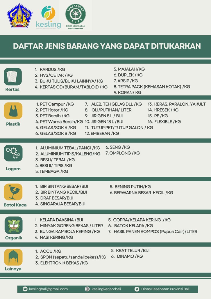 Menindaklanjuti Surat Edaran Gubernur Bali Nomor 09 Tahun 2025 tentang pengelolaan sampah berbasis sumber dan pembatasan penggunaan sampah plastik sekali pakai, Dinas Kesehatan (Dinkes) Provinsi Bali mendukung Kebijakan tersebut dengan membentuk Bank Sampah SEGER.