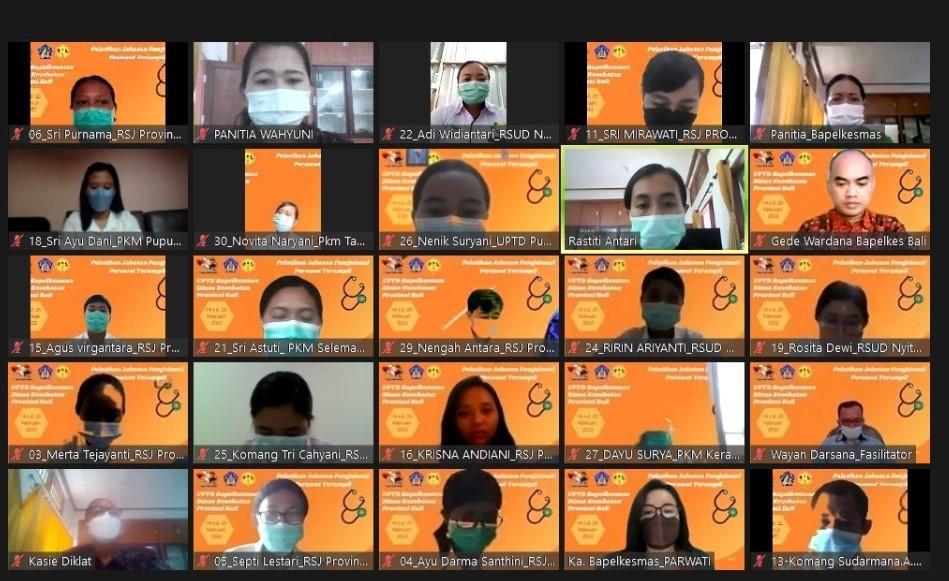 Untuk mencetak fungsional Perawat Profesional, UPTD Bapelkesmas Dinas Kesehatan Provinsi Bali (Diskes Bali) bekerjasama dengan Ikatan Perawat Jiwa Indonesia (IPJI) Provinsi Bali tengah melatih 30 orang calon perawat Profesional. Hal itu diungkapkan Kepala UPTD Bapelkesmas Dinas Kesehatan Provinsi Bali, Dr. Ni Made Parwati, SKM, M.Kes saat dihubungi Humas Dinas Kesehatan Provinsi Bali, Jumat, 18 Pebruari 2022.